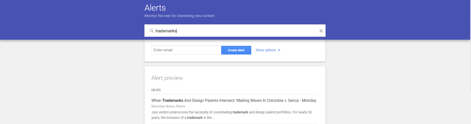 Another simple monitoring strategy is to set up Google alerts for your trademarks. Setting up a Google alert is a cost-effective way to scrape the web and be alerted of potential situations of infringement.